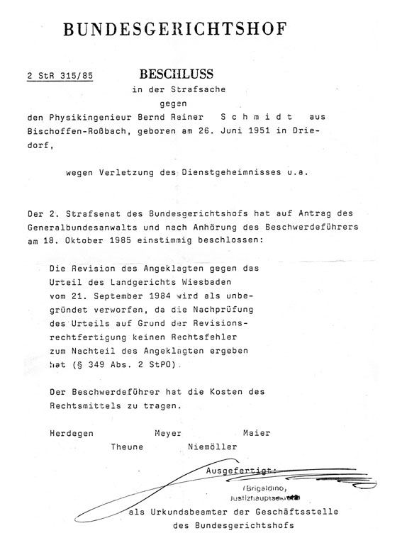- 6 JS 3730/83 - .............IM NAMEN DES VOLKES In der Strafsache gegen den Physikingenieur Bernd Rainer Schmidt (Joschko) ..... ...wegen Verletzungt des Dienstgeheimnisses pp. hat das Landgericht Wiesbaden - 3. Große Strafkammer - aufgrund der öffentlichen und nichtöffentlichen Hauptverhandlung vom 5., 11., 12. und 21. September 1984 an der teilgenommen haben: Vorsitzender Richter am LG Dr. Meyer als Vorsitzender ... für Recht erkannt.... wegen Verletzung des Dienstgeheimnisses zu 12 Monaten auf Bewährung verurteilt. Auszug aus der Begründung: "Offen bleiben kann nach Auffassung der Kammer die rechtliche Einordnung der Maßnahmen im Zusammenhang mit der Fahndung im terroristischen Umfeld im Raum Gießen, insbesondere die gezielte Beobachtung des Ehepaars Römer und von Frau Wolters über einen längeren Zeitraum. In der Beweisaufnahme konnte nicht geklärt werden, inwiefern diese offentsichtlich breit gestreute Aktion zur Ergreifung von terroristischen Gewalttätern beitragen konnte. Auch war keine irgendwie geartete Beteiligung der observierten Personen an bestimmten Straftaten erkennbar, so daß die Einordnung als Strafverfolgungsmaßnahme jedenfalls aus der subjektiven Sicht des Angeklagten ausscheidet. Die gegen die beobchteten Personen vorliegenden "staatsabträglichen Erkenntnisse" und die Absicht des BKA, diese Personen eine Zeitlang "unter Kontrolle zu haben", vermögen keine hinreichende Begründung für eine über längeren Zeitraum sich hinziehende gezielte Observation zu bieten. Da auch der Gesetzgeber offensichtlich bisher keine Regelungsnotwendigkeit für einen solchen Fall gesehen hat, kann dem Angeklagten nicht widerlegt werden, daß er sich zur Veröffentlichung in diesem Falle berechtigt fühlte und glaubte, die Öffentlichkeit auf diesen Mißstand hinweisen zu müssen. Jedenfalls aus der subjektiven Sicht des Angeklagten war sein Handeln nicht unrechtmäßig, was ihm auch nicht zum Vorwurf gemacht werden kann. Hinsichtlich der Mitteilungen über Aktionen in der B-Ebene (Frankfurter Hauptbahnhof), bei der Aktion "Paddy" und an der Frankfurter Hauptpost handelte der Angeklagte jedoch nicht im Verbotsirrtum. Die Kammer hat sich bei der Beurteilung des Verhaltens des Angeklagten an den Grundsätzen der Entscheidung des Bundesgerichtshofs vom 8.Nove,ber 1965 (BGH St 20, 342 ff) orientiert. Der Umstand, daß dem Angeklagten das Unrechtsbewusstsein nicht fehlte, wird schon daraus deutlich, daß er z.B. in dem Spielfilm "Alles unter Kontrolle" einmal mit seiner Festnahme rechnet und zum anderen erklärt, es werde da sicherlich etwas auf ihn zukommen. Im übrigen hat der Angeklagte nach eigener Einlassung nicht den Versuch unternommen, bei seinen Vorgesetzten wegen der von ihm vermuteten Illegalität der Video-Fahndung vorstellig zu werden. Daß diese Vorstellung möglicherweise keinen Erfolg gehabt hätten, befreit den Angeklagten nicht von der Verpfichtung, es wenigsten einmal zu versuchen. Auch hat der Angeklagte nicht daran gedacht und nichts unternommen, um z.B. Abgeordnete des Deutschen Bundestages einzuschalten, die für die Überwachung der Tätigkeit von Bundesbehörden zuständig wären. Er hat vielmehr sogleich den Weg in die Veröffentlichung gewählt, der aber das schwerwiegendste Mittel zur Preisgabe von Dienstgeheimnissen darstellt". ... "Bei der Strafzumessung ist zu Gunsten des Angeklagten zu berücksichtigen, daß der Angeklagte nicht vorbestraft ist und sich wegen der von ihm unterstellten Illegalität des Handels des Bundeskriminalamt in einer Konfliktlage sah. Jedenfalls ist zu seinen Gunsten davon auszugehen, daß er sich weder materielle Vorteile versprochen noch solche erlangt hat."