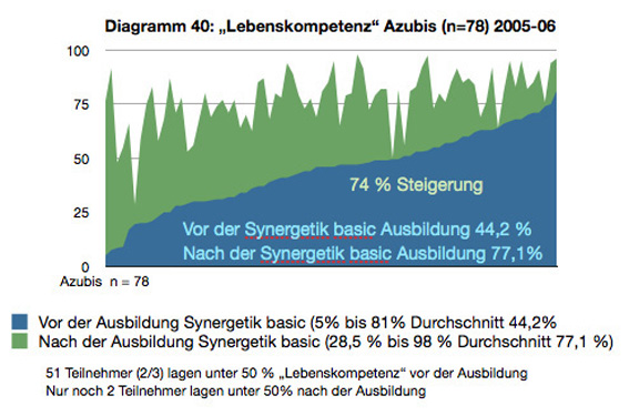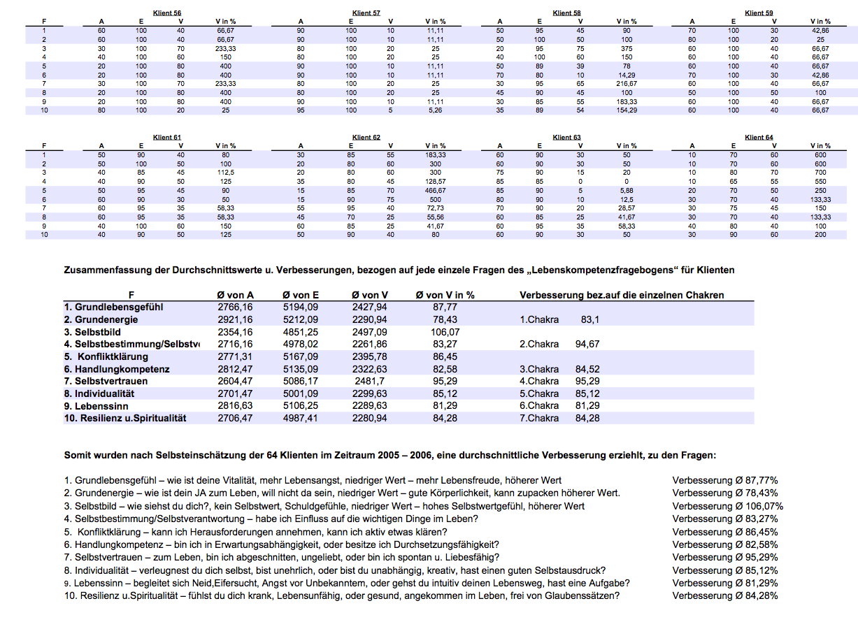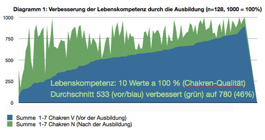 | Von 53 % verbessert auf 78% durch die Grundausbildung | 10 Qualitäten wurden abgefragt: Vor und nach der Ausbildung | Menschen mit Beschwerden oder Krankheiten profitierten besonders von dieser Therapie, die nur 1 Woche dauerte und die Lebenskompetenz nahezu verdoppelte. |