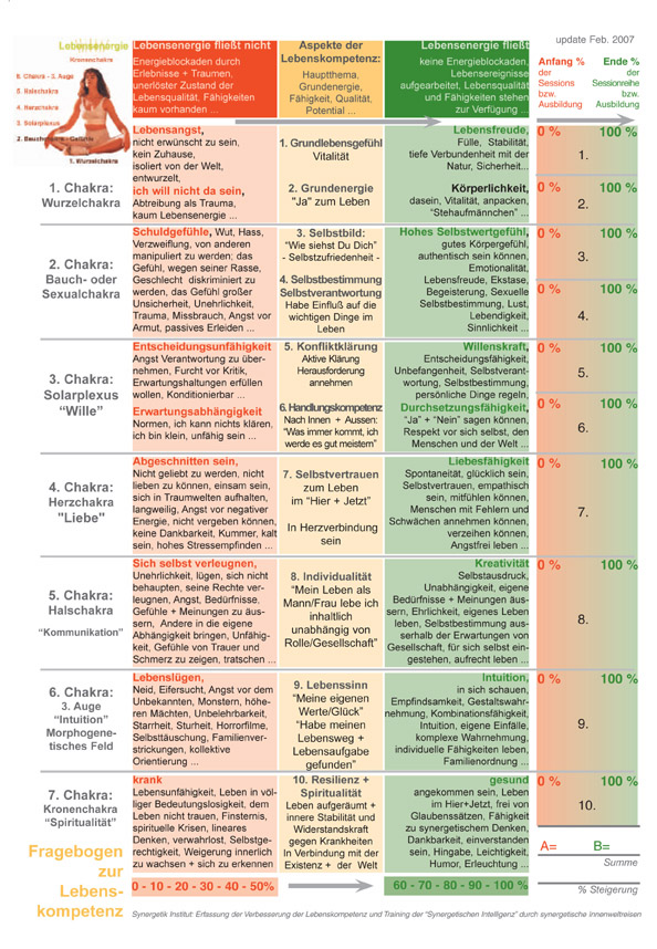 emergente Innenweltarbeit - Lebenskompetenzforschung - Verbesserung wichtiger Lebensparameter - Missing Link, der Einfluß der Psyche auf den Körper - Krankheitsheilung durch Steigerung der Resilienz - Traumatherapie – Die Traumata des Lebens aufräumen - Lebensverantwortung, Selbstverantwortung |