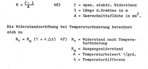 ging die Thermospannung runter. Folgende maximale Werte wurden erreicht: US = 1 V 0,0 mV US = 2 V 0,1 mV US = 4 V 0,12 mV US = 10 V 0,25 mV Dies entsprach bei einem Grundwert von 0,02 mV/°C einer maximalen Temperatur von ca. 12°C bei US = 10. V. Es wurde gegen Zimmertemperatur gemessen. Die Vergleichsmessstelle befand sich geschützt innerhalb der Sondenführungsstange. Die Drahtstärke der Zuleitungen war stärker, damit möglichst viel Spannungsabfall auf die Sondenspitze konzentriert wurde. Die Messung der Widerstandsänderung war problemlos. Folgende Möglichkeiten standen nun an: Transformatorhalbbrückenschaltung, um die Thermospannung auf höhere Werte zu transformieren bzw. Optimierung der Sonde als Widerstandsänderung mittels TF-MB. Die letzte Möglichkeit erschien erfolgversprechender und die Forderung nach einer räumlich konzentrierten Widerstandssonde mit relativ großem Widerstand –damit die relative Widerstandsänderung voll auf die TF-MB zurückwirken kann- stand an. Das Drahtmaterial musste einen möglichst hohen spezifischen elektrischen Widerstand bei gleichzeitigem hohen Termperaturbeiwert besitzen – der Drahtdurchmesser musste so niedrig wie nur möglich sein, da sich der Widerstand eines Drahtes nach folgender Formel berechnet: |