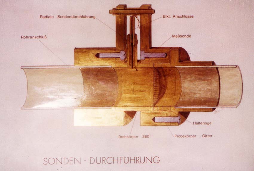Die Sondendurchführung Abb. 17 zeigt die Sondendurchführung als perspektivisches Schnittbild, Abb. 18 im eingebauten Zustand. Drei um je 120° versetzte Schraubenverbindungen halten die Rohransclüsse zusammen. In der Mitte ist ein Drehkörper –360° drehbar- mit der radialen Sondeneinführung eingepasst. Durch eine Schraube mit Feingewinde lässt sich die aufgebohrte Sondenführungsstange radial einfahren ohne sich selbst mitzudrehen (Drehbleistiftprinzip). Die Anschlussrohre werden ein eingepasst. Hinter bzw. vor der Messsondeneinführung – je nach der Strömungsrichtung – sind zwei Halteringe zur Aufnahme der Probekörper eingepasst. Je nach der Einspannstelle kann dadurch der Abstand Sonde – Probekörper 3fach variiert werden. Sollen Probekörper eingesetzt werden, brauchen nur drei um 120° versetzte Schrauben gelöst zu werden – auf der rechten Seite in Abb. 17. Die gesamte Sondendurchführung wird durch einfache Schmiermitteldichtung abgedichtet. Die Führungsnut der Sondenführungsstange ist allerdings mit Teflon abgedichtet. Die technischen Zeichnungen befinden sich im Anhang. |