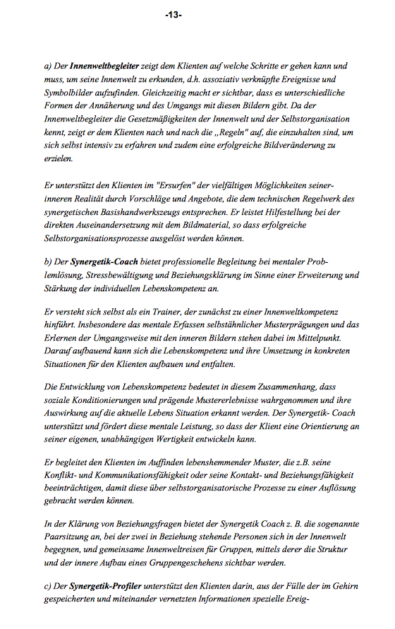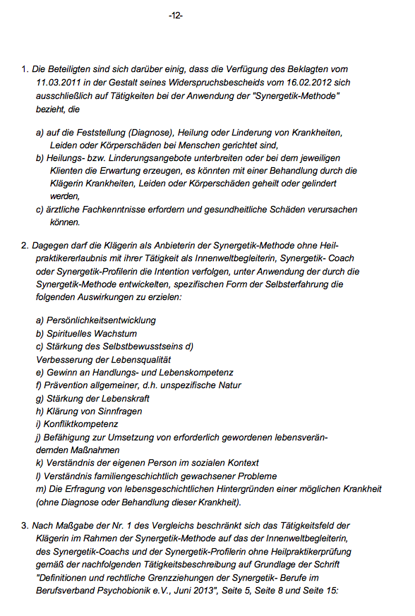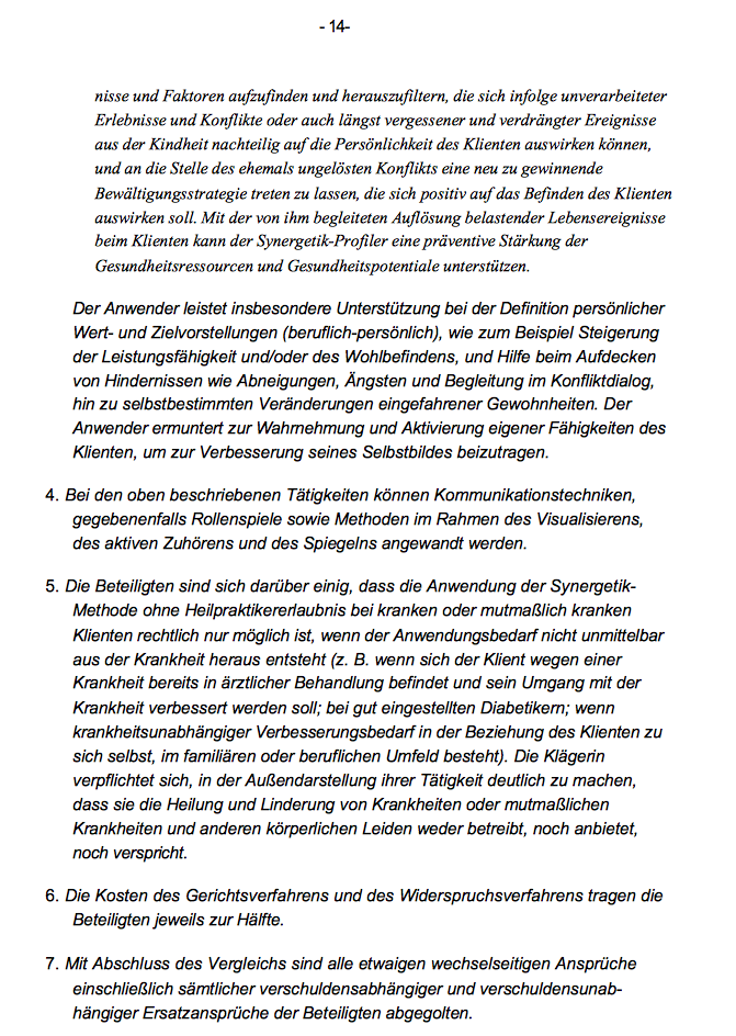 Aus dem Urteil von 2016: "In dem Erörterungstermin vom 07.05.2013 vor dem Berichterstatter haben sich die Beteiligten daruüber verständigt, Vorschläge für eine Grenzziehung zwischen erlaubter und nicht erlaubter Tätigkeit bei der Anwendung der Synergetik-Methode als Grundlage für einen gerichtlichen Vergleichsvorschlag zu erarbeiten. Auf Basis der von den Beteiligten hierzu eingereichten Formulierungen einschließlich der gewechselten Stellungnahmen hierzu unterbreitete ihnen das Gericht mit Beschluss vom 30.01.2015 folgenden Vergleichsvorschlag: