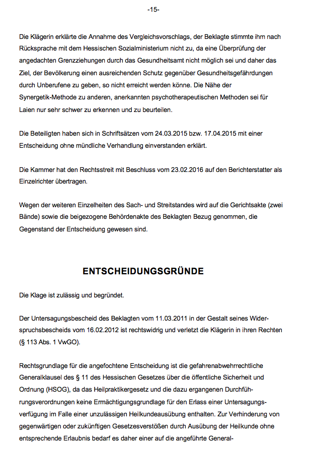 Hier Auszüge des endgültigen Urteils von 2016, denn das Verwaltunsgericht hatte eine direkte Klärung zwischen dem Hessischen Ministerium und dem Berufsverband, sowie dem Begründer der Synergetik Therapie, Bernd Joschko, angeregt und als Kompromiss ein Urteil definiert, das aber vom Ministerium abgelehnt wurde. So wurde Edith Eyrich als Synergetik Profilerin voll umfänglich freigesprochen, zu Lasten der Staatskasse. Im Urteil wurde klar bestätigt, das immer der Einzelfall genau berücksichtigt werden muß und die angebotene Dienstleistung. Das hatte vorher schon in 2010 das Landgericht Frankfurt bei eine Synergetik Therapeutin in 35 Fällen aufgeschlüsselt und 21 Freisprüche ausgesprochen. Der BGH bestätigte diese Sichtweise 2011. (Hier beschreibt die Synergetik Therapeutin Gudrun Esser aus ihrer Perspektive - klicken.)